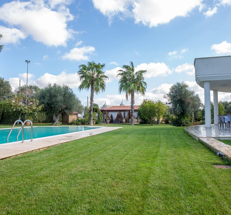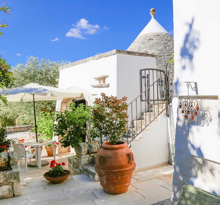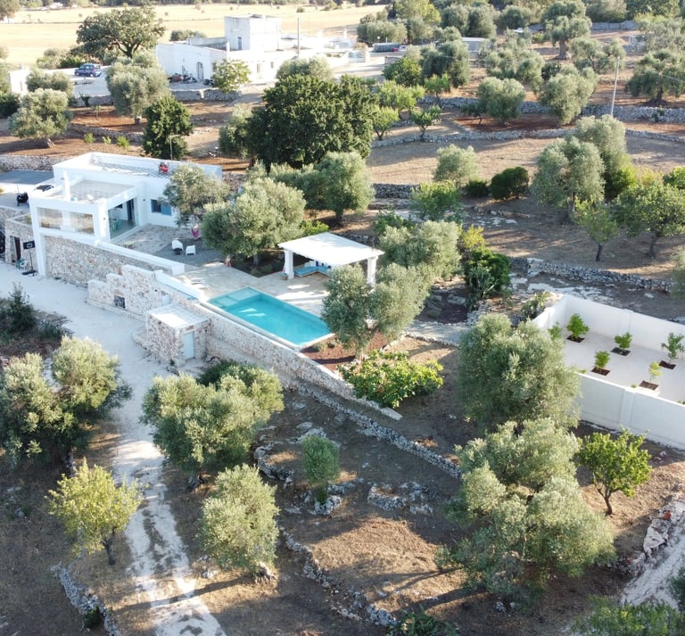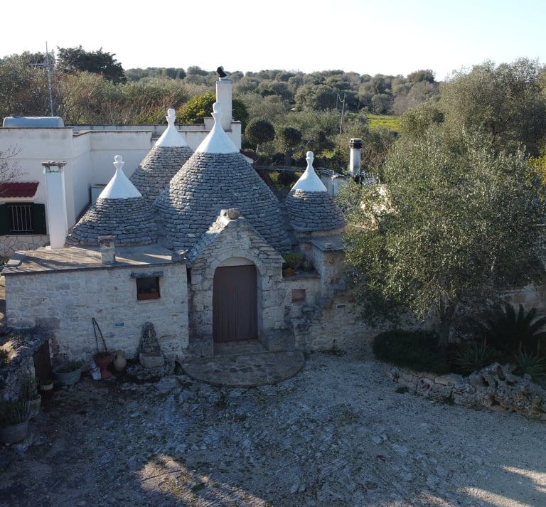 Strategisch zwischen Locorotondo, Martina Franca und Alberobello gelegen, besteht diese Anlage aus 10 Trulli, aufgeteilt in vier unabhängige Wohneinheiten. Jede Einheit verfügt über einen eigenen Eingang und Außenbereich. Das Anwesen liegt in einem 1 Hektar großen Hügelpark mit Olivenbäumen und mediterranen Pflanzen. Im Zentrum befindet sich ein beheizter Salzwasser-Swimmingpool.