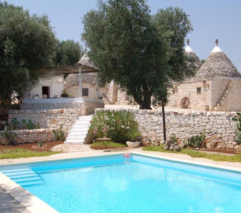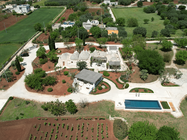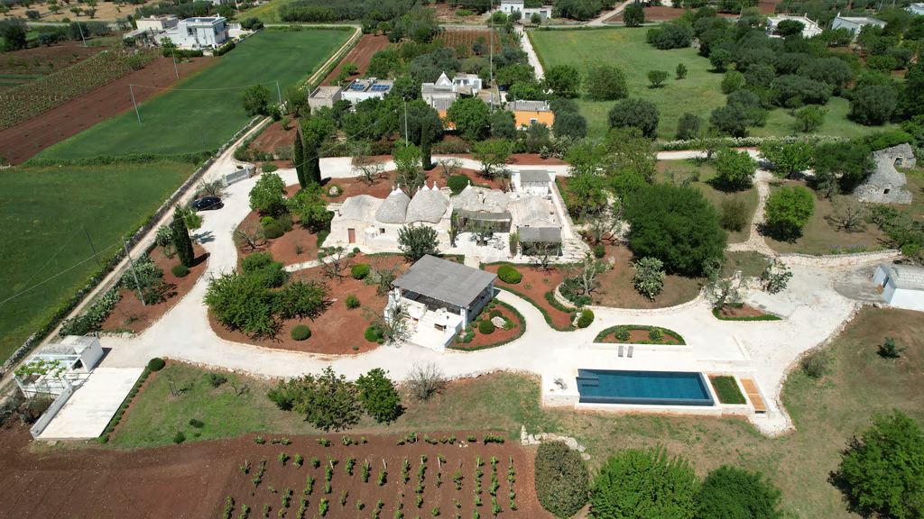 Dieses Anwesen, zugänglich durch ein automatisches Tor, bietet Parkplätze und eine beleuchtete Kiesauffahrt. Es besteht aus einer Villa mit Trullo, zwei Lamien und einem weiteren Trullo mit Lamia, jeweils mit Schlafzimmern und Bädern, die flexibel genutzt werden können. Der Außenbereich lädt mit Entspannungsbereichen unter Olivenbäumen und einem Infinity-Pool zum Verweilen ein. Das Grundstück mit 105 Oliven- und 40 Obstbäumen ist ideal als exklusive Residenz, Rückzugsort oder Bed & Breakfast.